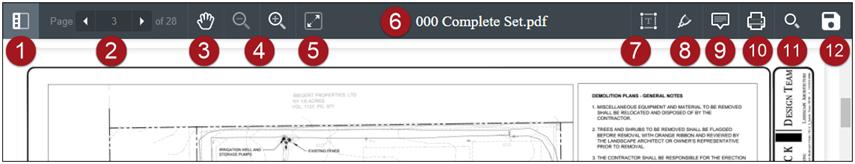 7. Text tool – click to add a text box to the PDF. 8. Ink tool – click to freehand draw on the PDF. 9. Note tool – click to add a note on the PDF. 10. Print tool – click to print the PDF with markups. 11. Search tool – search for terms in text or note markups 12. Save – saves the markups to Projectmates |