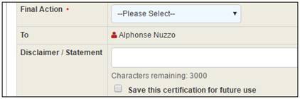 3. Select the Final Action from the drop-down menu. 4. Add a Disclaimer/Statement. 5. Click on the check box if you want to Save this certification for future use. |