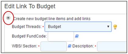 If you select the Create new budget line items option, the pop-up will prompt you to provide the Budget Thread, Budget/Fund Code, WBS/Section, and Description for the line item.