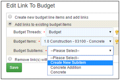 3. The system gives you three options: · Create new budget line items and add links – Select this option if the line items you want to link do not yet exist in the budget. · Add links to existing budget items – Select this option if the line items you want to link are already listed as subitems in the budget. · Remove link(s) without deleting existing budget item(s) – Select this option if the line items are inappropriately linked to the budget. |